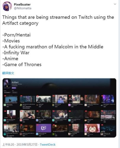 近日,有网友Pixelbuster在推特抱怨,Twitch平台上的《Artifact》直播区已变成“大杂烩”,虽然主播们都贴着《Artifact》的标签,但实际上播片的播片、看番的看番,没几个人在直播《Artifact》。