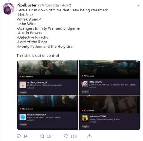 Pixelbuster还列出了近期他在Twitch平台《Artifact》区看过的电影直播的清单,从《大侦探皮卡丘》到《复仇者联盟4》应有尽有。