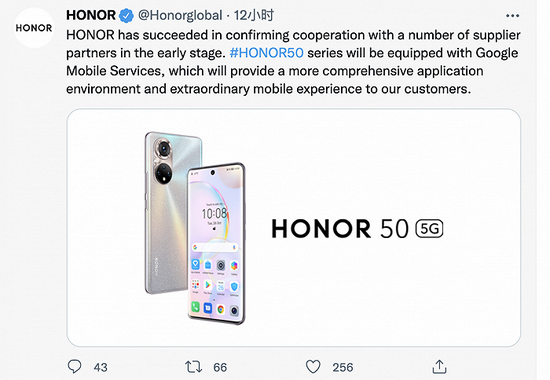 10月11日,荣耀在海外官方社交平台公布,目前荣耀已恢复与谷歌的合作,其中HONOR 50系列海外版本将搭载Google Mobile Services(GMS)。