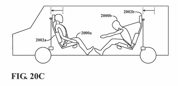 该专利显示,经过苹果改进的乘员安全系统包括座舱分隔装置、动态座椅系统、拉紧的约束装置和充气约束装置,而充气约束装置包括自行系链安全气囊、座椅安全带和/或腰部安全带安全气囊等,在座椅相对设置的车辆中,如果发生碰撞,能够提升乘员的安全性。