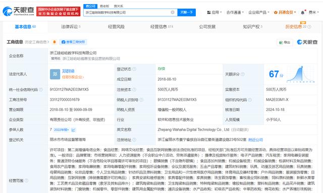 浙江娃哈哈数字科技有限公司成立于2018年8月,注册资本500万人民币,经营范围含第二类增值电信业务、食品经营、网络文化经营、食品互联网销售、品牌管理、市场营销策划等,现由杭州娃哈哈宏振投资有限公司、宗馥莉共同持股。