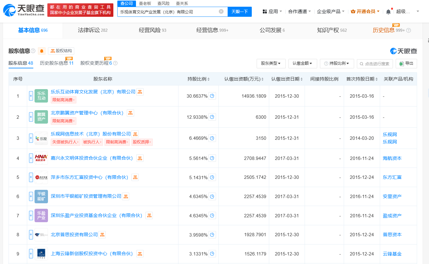 乐视体育文化产业发展(北京)有限公司成立于2014年3月,法定代表人为何晓丹,注册资本约4.87亿人民币,经营范围包括从事互联网文化活动、广播电视节目制作、组织文化艺术交流活动等,由乐乐互动体育文化发展(北京)有限公司、乐视网信息技术(北京)股份有限公司、北京普思投资有限公司等共同持股。风险信息显示,该公司2020年、2023年、2024年均被列为经营异常。