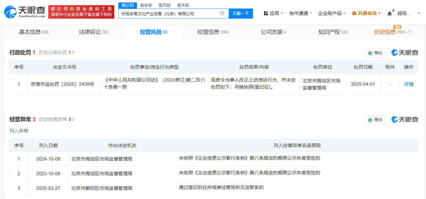 天眼查App显示,近日,乐视体育文化产业发展(北京)有限公司因违反《中华人民共和国公司法》(2023修订)第二百六十条第一款,被北京市海淀区市场监督管理局吊销执照(登记证)。