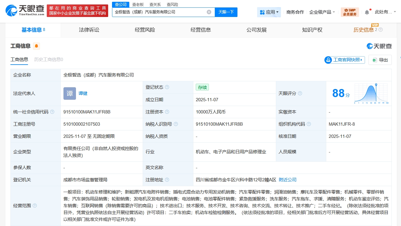 近日,全极智选(成都)汽车服务有限公司成立,法定代表人为谭健,注册资本1亿人民币,经营范围含机动车修理和维护、新能源汽车电附件销售、插电式混合动力专用发动机销售、汽车零配件零售、润滑油销售、摩托车及零配件零售、二手车经纪、二手车拍卖等。