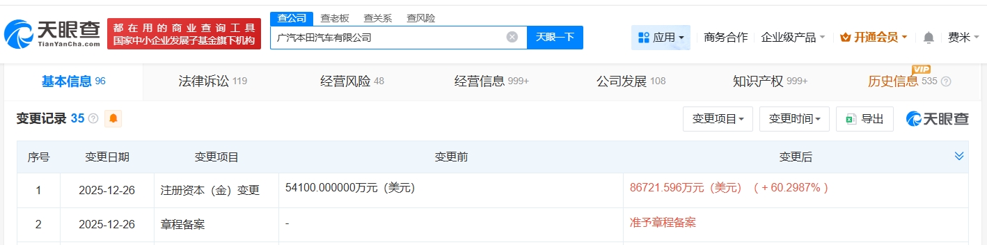 广汽本田汽车有限公司成立于1998年5月,法定代表人为高锐,经营范围包括汽车零部件及配件制造、新能源汽车整车销售、汽车零配件批发等,由广州汽车集团股份有限公司、本田技研工业株式会社、本田技研工业(中国)投资有限公司共同持股。变更记录显示,去年12月,该公司注册资本由5.41亿美元增至约8.67亿美元,增幅约60%。