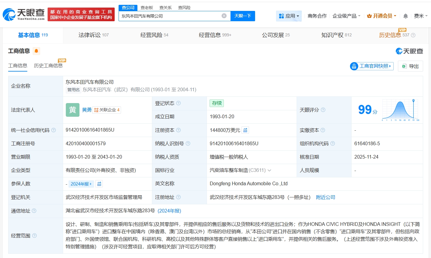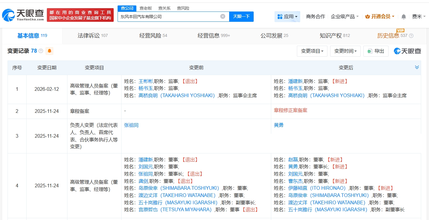 天眼查App显示,东风本田汽车有限公司成立于1993年1月,法定代表人为黄勇,注册资本14.48亿美元,经营范围包括设计、研制、制造和销售乘用车及其零部件,并提供相应的售后服务以及货物和技术的进出口业务等。股东信息显示,该公司由东风汽车集团股份有限公司、日本本田技研工业株式会社、本田技研工业(中国)投资有限公司共同持股。变更记录显示,去年11月,该公司发生工商变更,张祖同卸任法定代表人、董事长,由黄勇接任。