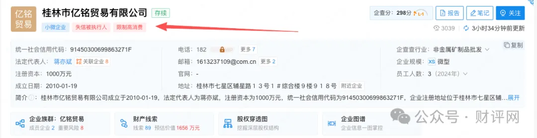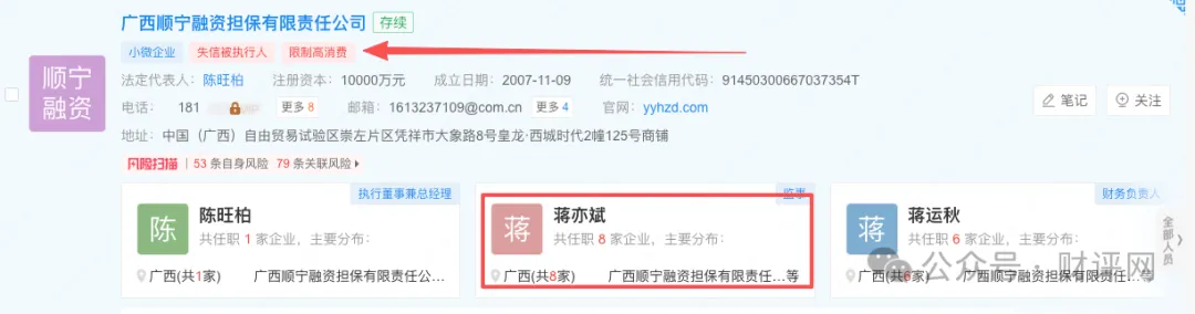 同正旭宁小贷的第一大股东为桂林市亿铭贸易有限公司,持股比例20%,其余股东均为个人。桂林亿铭成立于2010年,实控人为蒋双林,该公司已被列入失信被执行人。