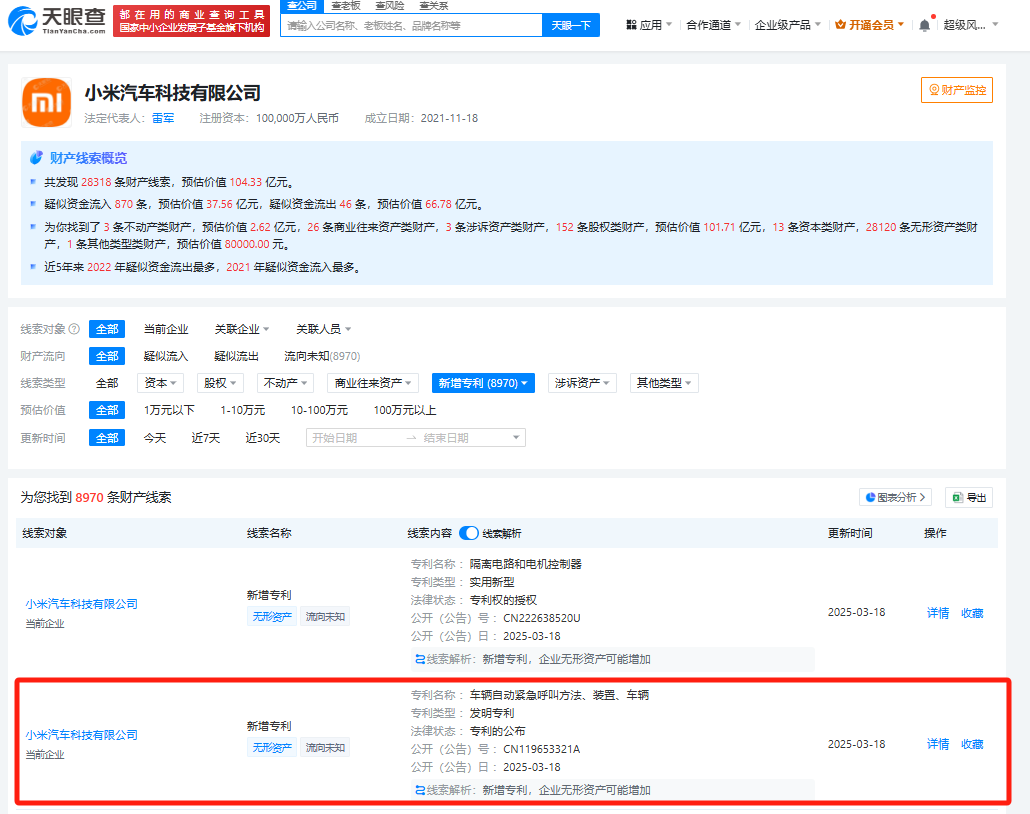 天眼查财产线索信息显示,近日,小米汽车科技有限公司申请的“车辆自动紧急呼叫方法、装置、车辆”专利公布。
