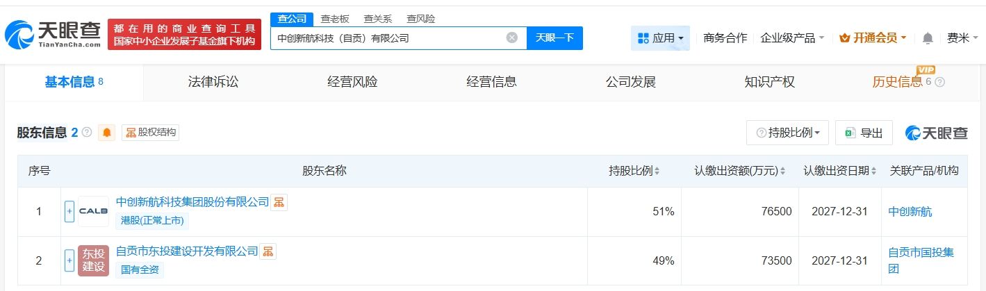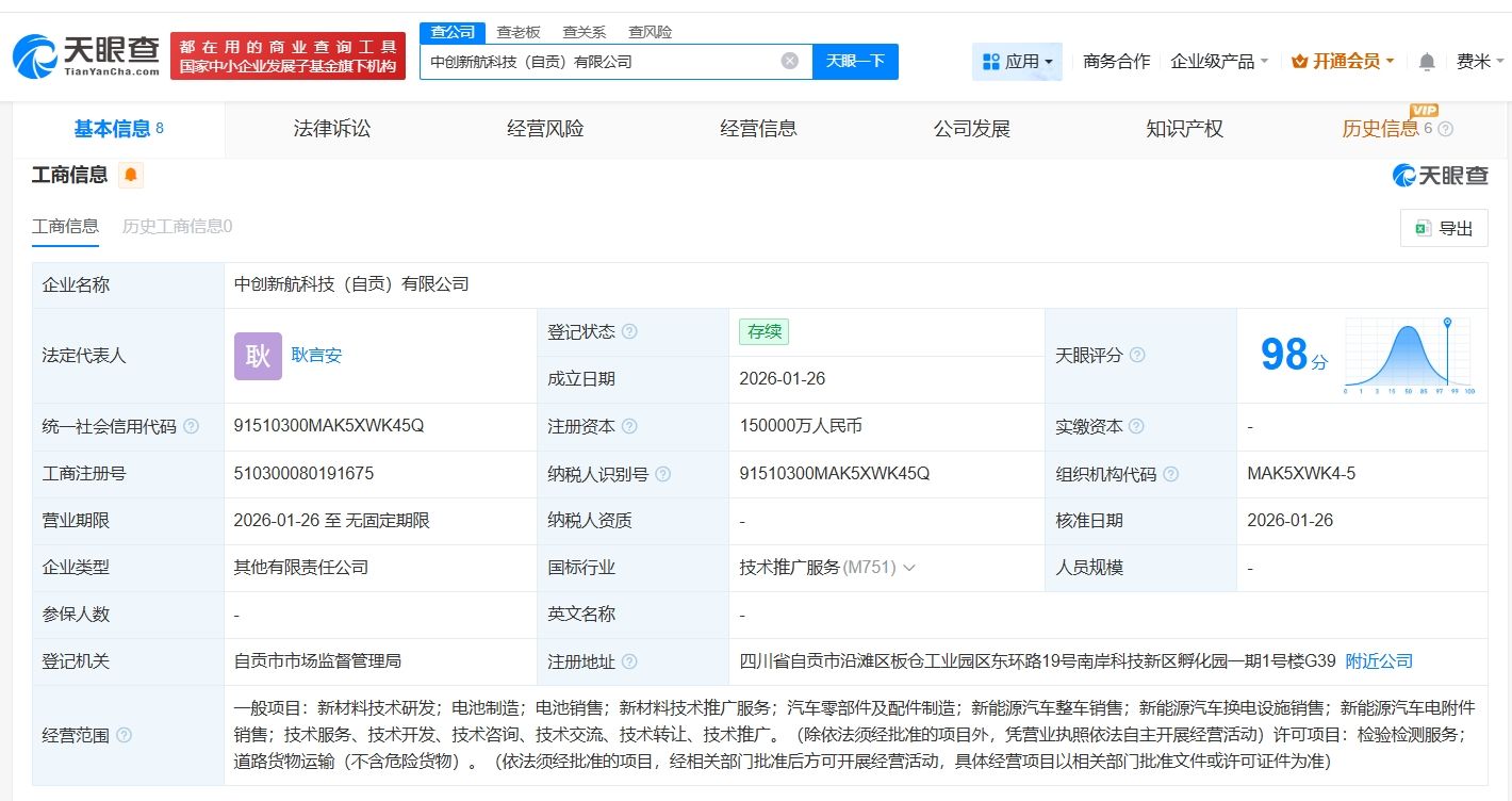 天眼查App显示,近日,中创新航科技(自贡)有限公司成立,法定代表人为耿言安,注册资本15亿人民币,经营范围包括新材料技术研发、电池制造、电池销售等,由中创新航(03931.HK)、自贡市东投建设开发有限公司共同持股。