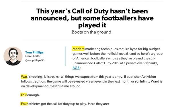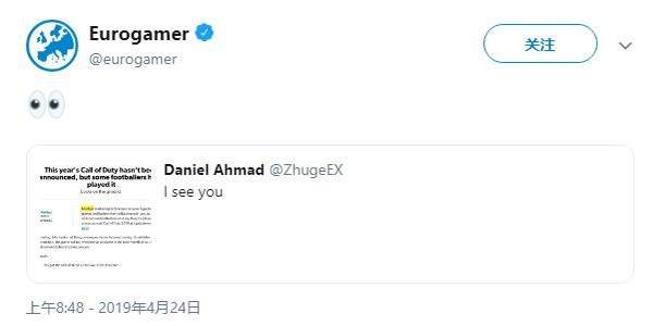 另外,外媒Eurogamer在报道此事时,文章开头四段的首个单词连起来是“Modern War Fair Four”,要说这纯粹是巧合估计也没人会相信。这一细节被网友发现后,还得到了Eurogamer的转发,疑似盖章大家对《使命召唤》新作为“现代战争4”的猜测。