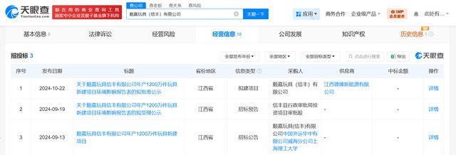 天眼查App显示,顺嘉玩具(信丰)有限公司成立于2024年7月,法定代表人为柯晓鹏,注册资本1000万人民币,经营范围为玩具制造、玩具销售、劳务服务,由郭俊贤全资持股。招投标信息显示,该公司已发布多个关于“年产1200万件玩具新建项目”的招标公告、招标预告等。