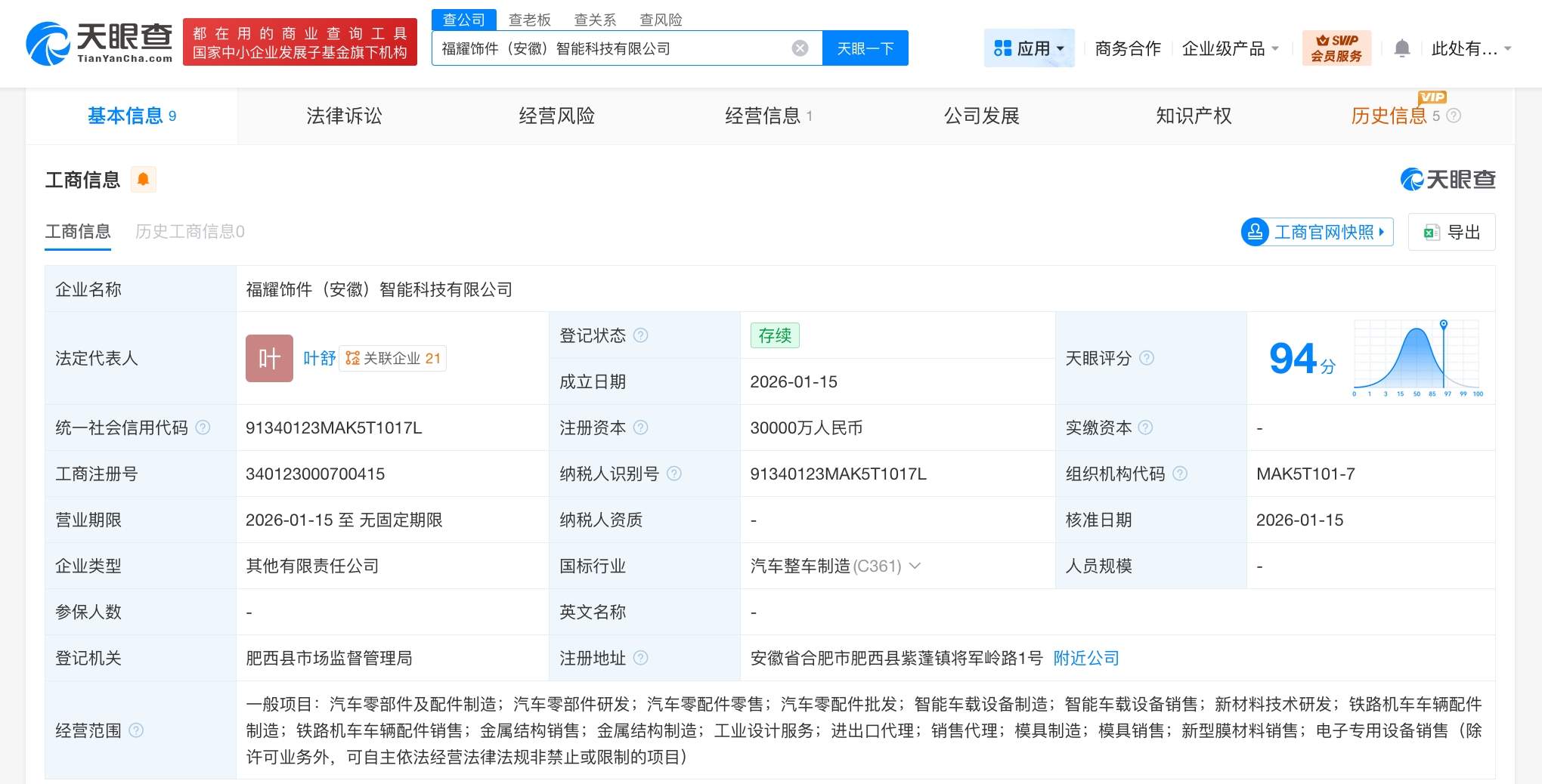 天眼查工商信息显示,近日,福耀饰件(安徽)智能科技有限公司成立,法定代表人为叶舒,注册资本3亿人民币,经营范围含汽车零部件及配件制造、汽车零部件研发、汽车零配件零售、汽车零配件批发、智能车载设备制造、智能车载设备销售、新材料技术研发、铁路机车车辆配件制造、铁路机车车辆配件销售等。