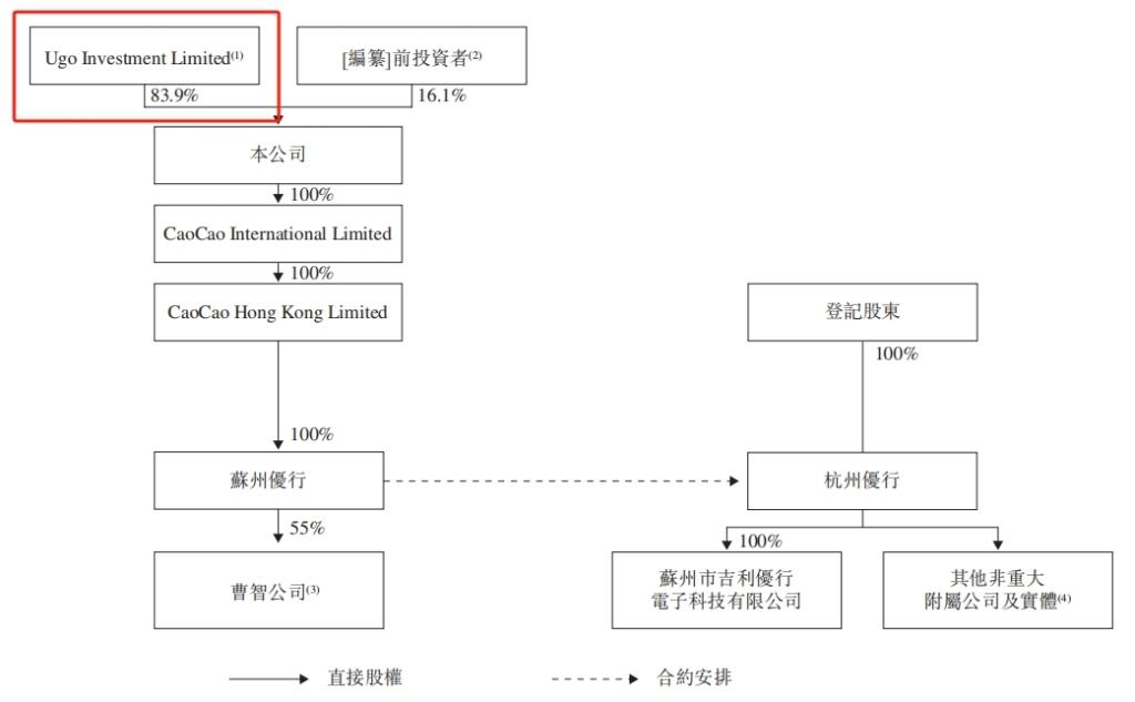 资料显示,曹操出行于2015年由吉利控股集团孵化成立,总部位于苏州。IPO前,吉利控股集团创始人李书福旗下Ugo Investment Limited持股为83.9%。
