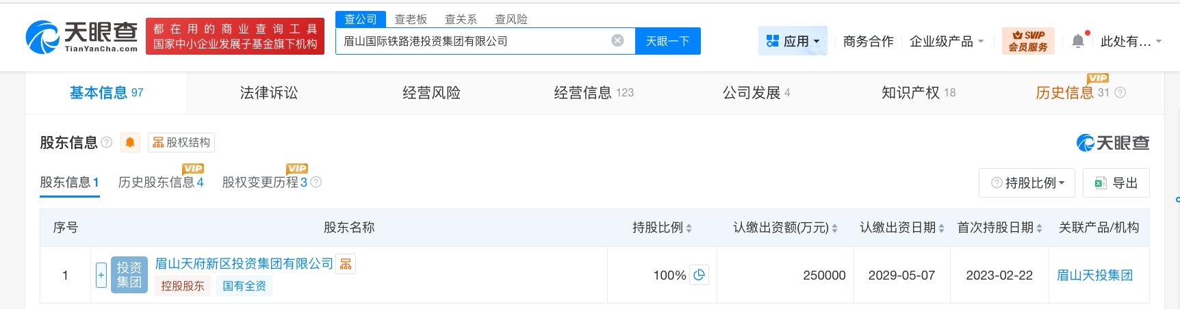 天眼查工商信息显示,近日,眉山国际铁路港投资集团有限公司发生工商变更,注册资本由10亿人民币增至25亿人民币,增幅150%。