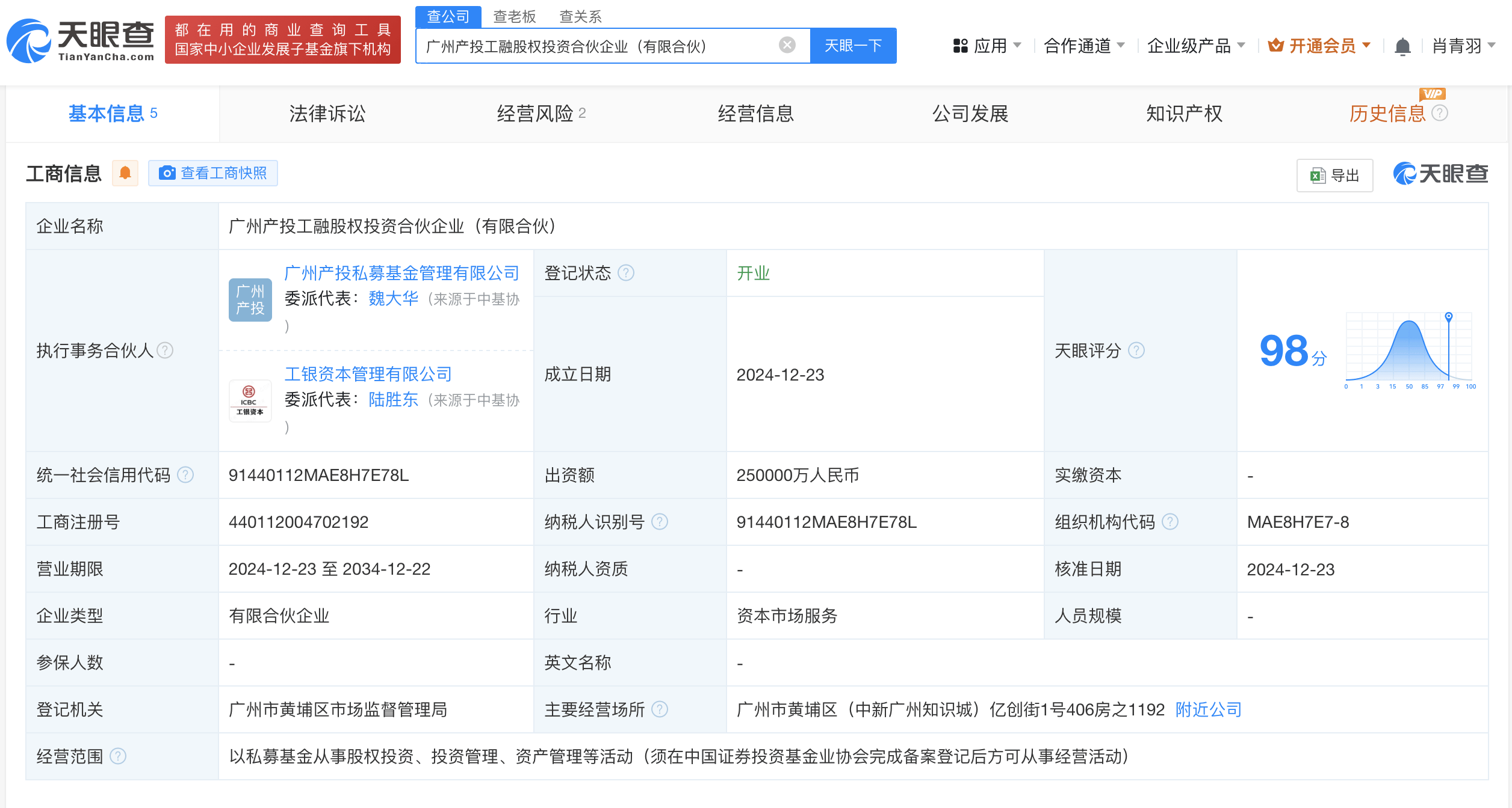 天眼查App显示,近日,广州产投工融股权投资合伙企业(有限合伙)、广州工融产投股权投资合伙企业(有限合伙)成立,执行事务合伙人均为广州产投私募基金管理有限公司、工银资本管理有限公司,出资额均为25亿人民币,经营范围均为以私募基金从事股权投资、投资管理、资产管理等活动。