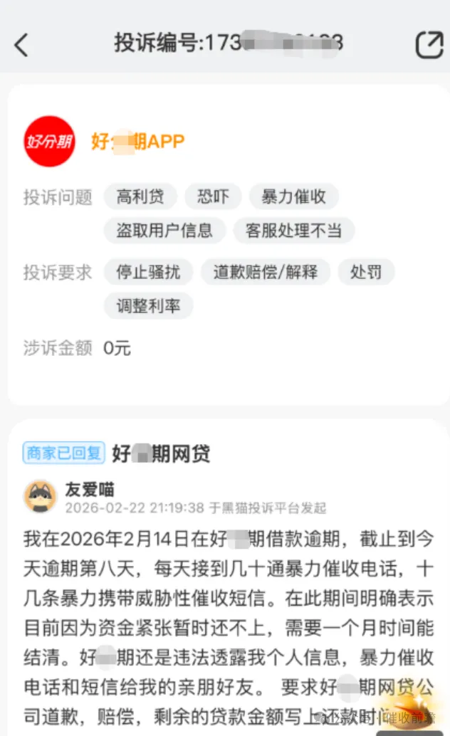 此次好分期春节期间的暴力催收事件,并非网贷行业的个例。近期黑猫投诉平台上,多起网贷投诉均指向春节期间的爆通讯录、骚扰家人等行为,反映出部分网贷平台为了回款,置法律法规和行业规范于不顾,将催收的压力转嫁给借款人的家人和亲友。而对于借款人而言,本想通过网贷缓解经济困难,却不料陷入债务与催收的双重困境,甚至牵连家人,维权之路往往举步维艰。
