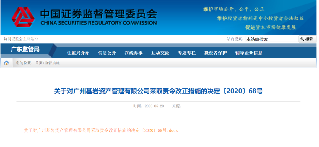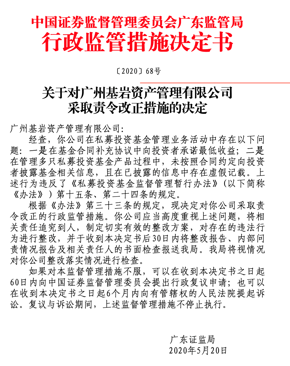 基岩资管在520这一天收到了广东证监局责令其整改的处罚决定书。