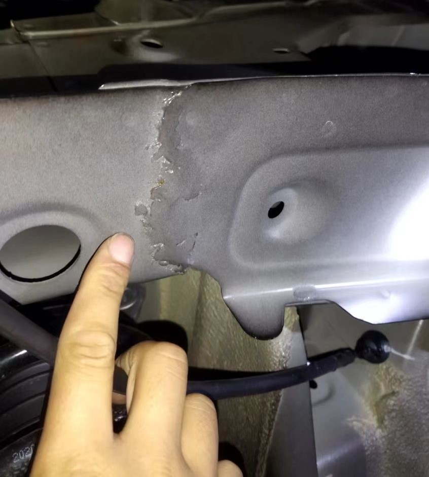 检车家机动车鉴定评估(成都)有限公司的吴先生告诉南都·湾财社记者,从该车的检测报告书中,对查验结果有更详细的说明:前翼子板固定螺丝拧动痕迹表现为螺丝头的漆面脱落、移位。这些痕迹指示螺丝曾遭受过拧动或拆装,导致螺丝头部漆面受损。左前翼子板螺丝移位是由于左前翼子板在拆卸和安装过程中,原来的固定螺丝位置发生偏移的现象,但左前翼子板并未发现修复及更换。左前翼子板内骨架存在明显的烧焊痕迹,和右侧相同位置采用的螺栓固定方式存在明显差异。同时左前翼子板骨架烧焊位置存在加工焊丝的残留,所以车辆的左前翼子板骨架存在烧焊的痕迹,不符合车辆原有的结构状态。