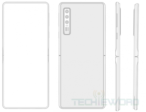 从泄露的专利图片和渲染图可以看到,这款手机的折叠铰链位于中间偏下的位置,因此手机折叠后机身正面的额头部分会漏在外面;另外,音量键和电源键位于手机右侧,没有发现“home”键和指纹解锁,但该机可能采用屏下指纹解锁。