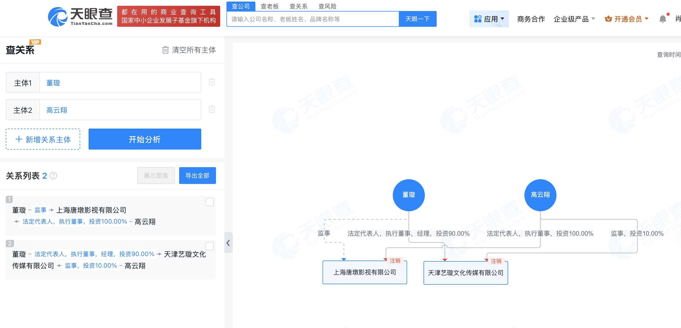 天眼查查关系信息显示,董璇与高云翔曾共同关联的2家公司均已注销,分别是上海唐墩影视有限公司、天津艺璇文化传媒有限公司。