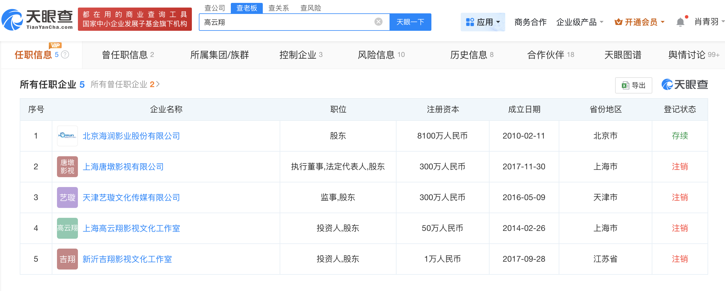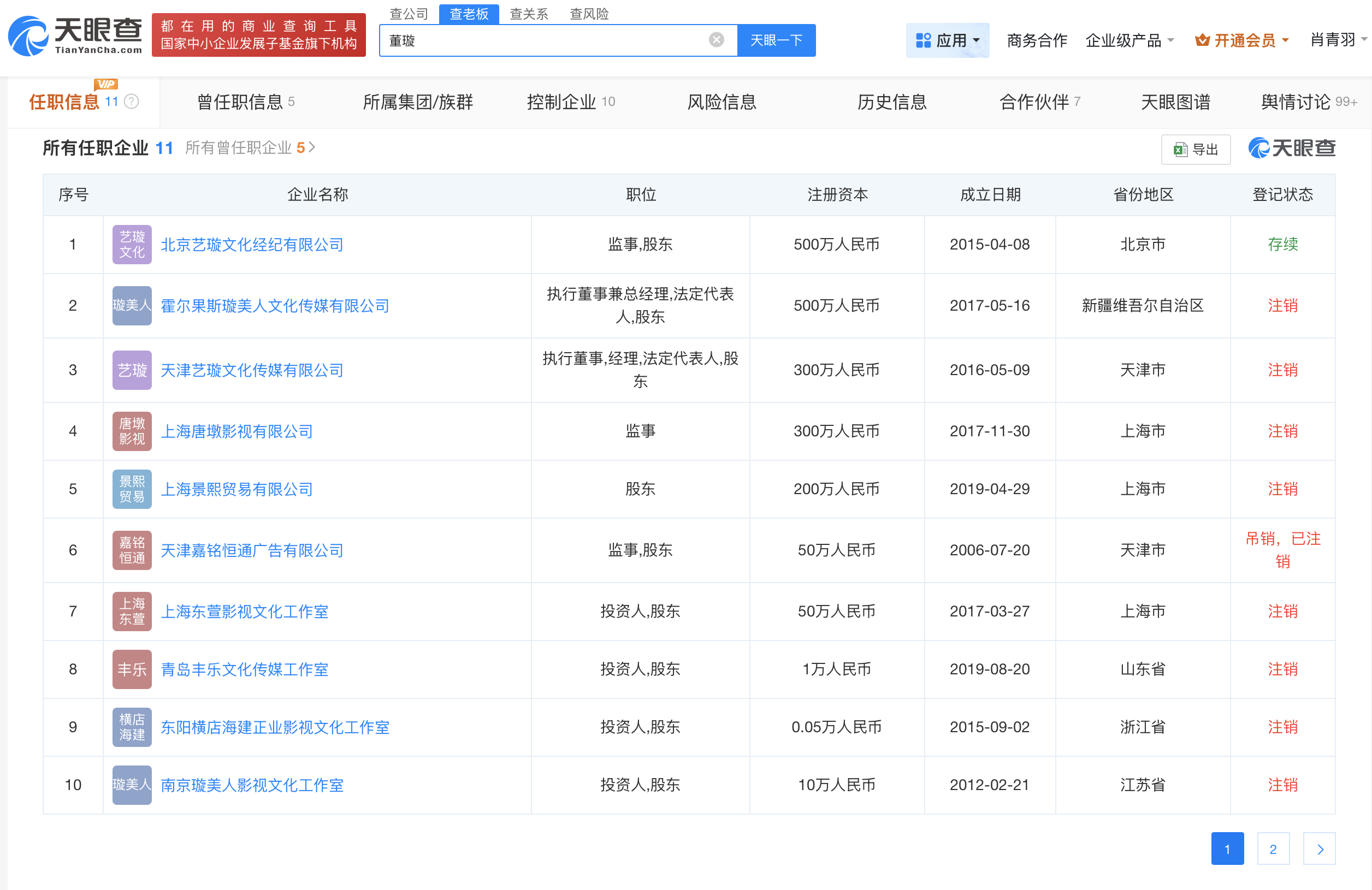 天眼查App显示,董璇名下关联10余家企业,目前仅北京艺璇文化经纪有限公司处于存续状态,董璇全资持股该公司并担任监事职务,其余企业均已注销。高云翔名下关联5家企业,目前仅北京海润影业股份有限公司处于存续状态,其余4家企业已注销。此外,今年5月,高云翔新增一则恢复执行信息,执行标的4942万元,该案件被告为北京艺璇文化经纪有限公司及高云翔,涉及演出合同纠纷案件,执行法院为北京市第一中级人民法院。
