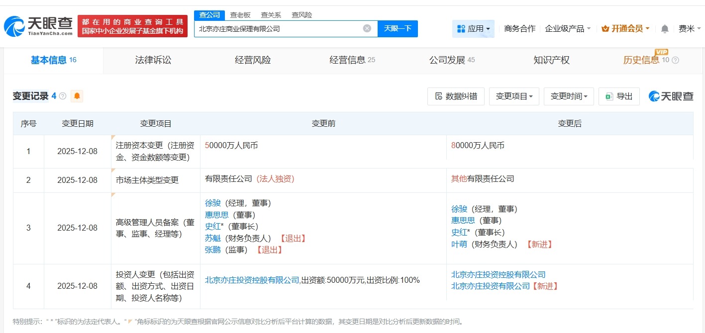 天眼查App显示,近日,北京亦庄商业保理有限公司发生工商变更,新增北京亦庄投资有限公司为股东,注册资本由5亿人民币增至8亿人民币,增幅60%,同时,部分高管发生变更。