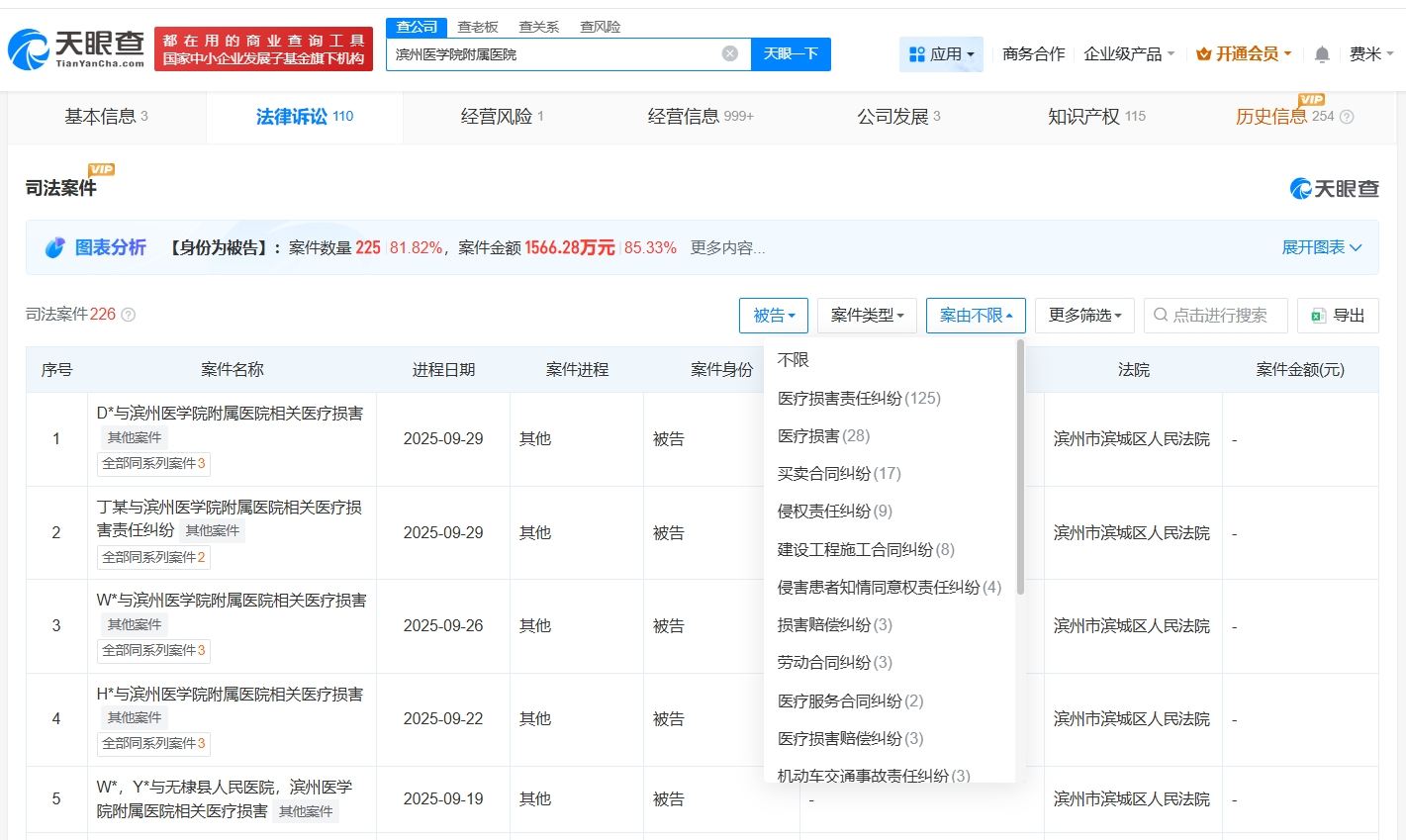 天眼查App显示,涉事医院滨州医学院附属医院法定代表人为王玉玖,开办资金约8.3亿人民币,宗旨和业务范围为面向社会提供医疗、预防、保健、康复服务,开展临床教学和医疗科研,培养卫生专业人才,法律诉讼信息显示,该医院曾因医疗损害责任纠纷、医疗损害赔偿纠纷、医疗服务合同纠纷等被起诉。