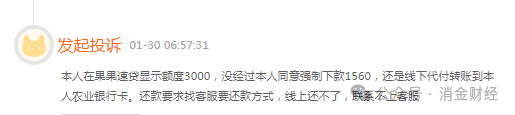 从黑猫投诉用户投诉就可以看到,消费者办理一款果果速贷的产品,显示额度3000,强制下款1560,还款需要找客服还款。由于这些公司无地址、无牌照,基本投诉无门,用户一旦违约,通过抓取用户通讯录名单进行暴力催收、恐吓威胁。
