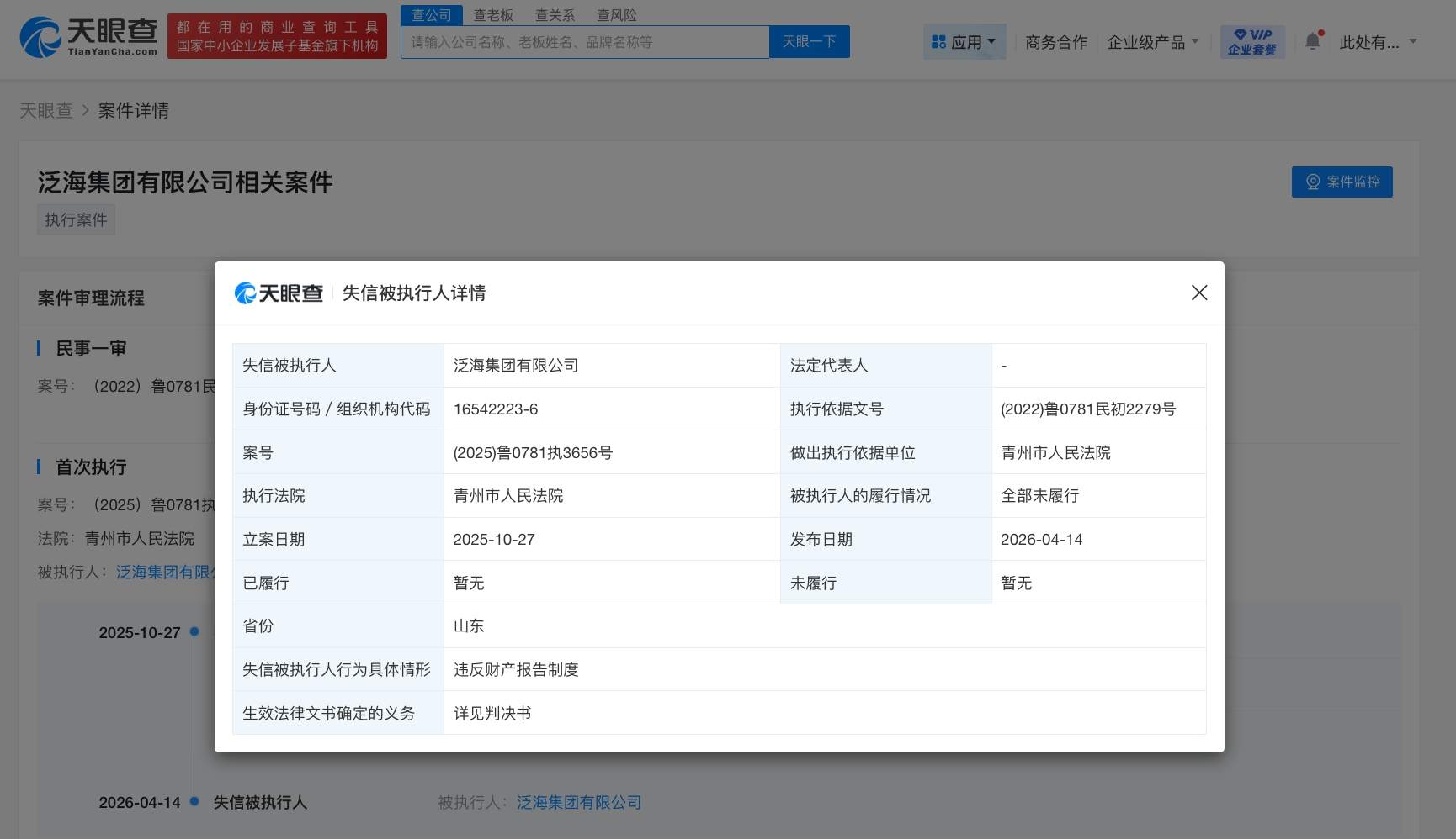 天眼查法律诉讼信息显示,近日,泛海集团有限公司因违反财产报告制度,被青州市人民法院列为失信被执行人(老赖),履行情况为全部未履行。案件流程信息显示,2025年10月,该公司被执行190.3万余元。