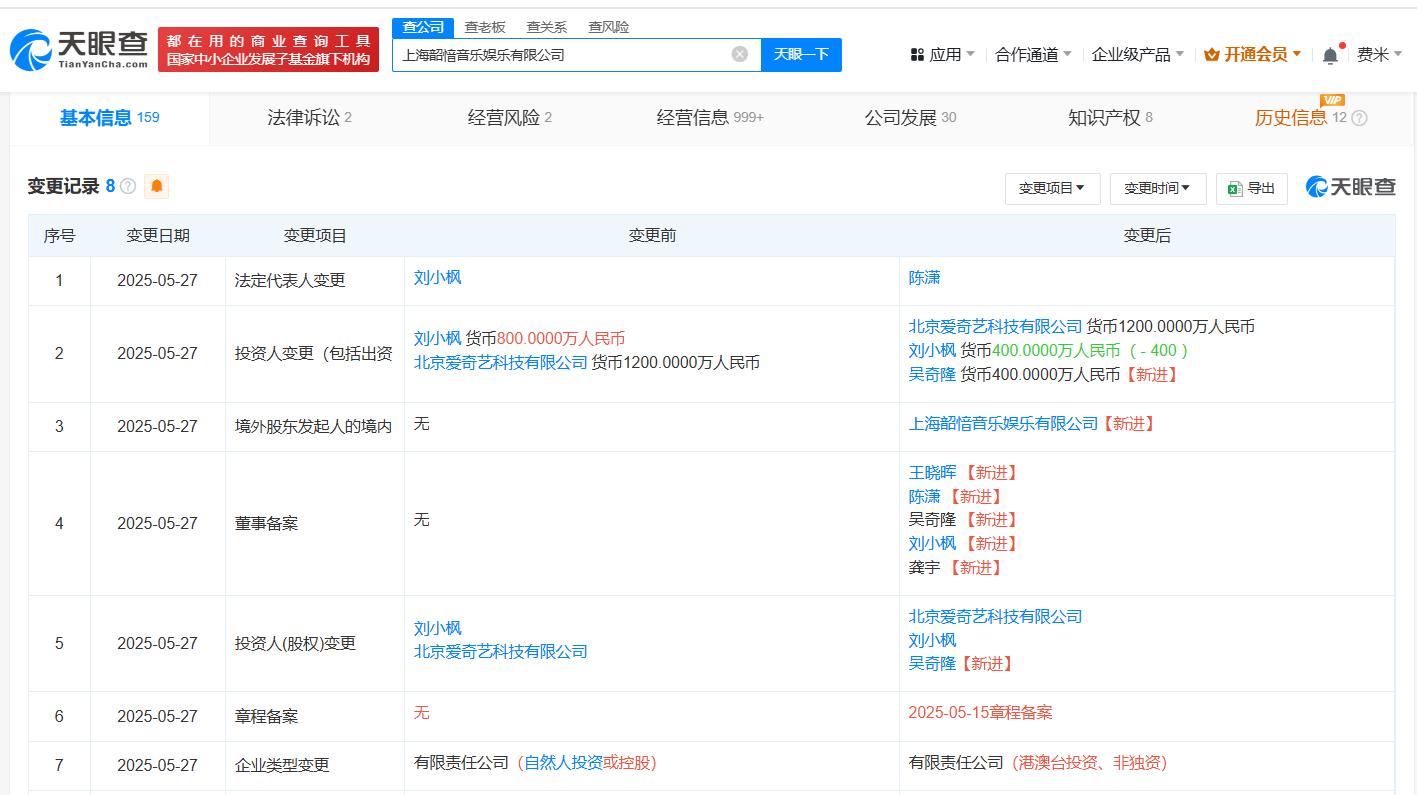近日,上海韶愔音乐娱乐有限公司发生工商变更,新增吴奇隆为股东并担任董事;刘小枫卸任法定代表人、总经理,担任董事一职;新增龚宇为董事长;由陈潇任法定代表人、经理、董事。