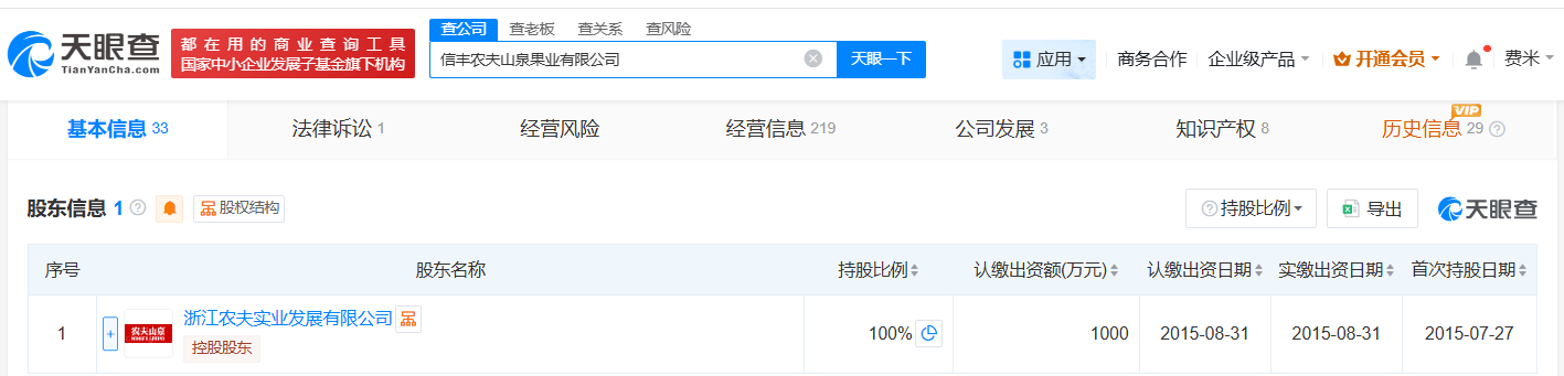 信丰农夫山泉果业有限公司成立于2015年7月,注册资本1000万人民币,经营范围包括饮料生产、食品生产、食品销售等。股东信息显示,该公司由浙江农夫实业发展有限公司全资持股。值得一提的是,此前,钟睒睒已卸任浙江养生堂保健品销售有限公司、农夫山泉杭州千岛湖饮用水有限公司、农夫山泉湖北丹江口(均州)饮料有限公司的法定代表人。
