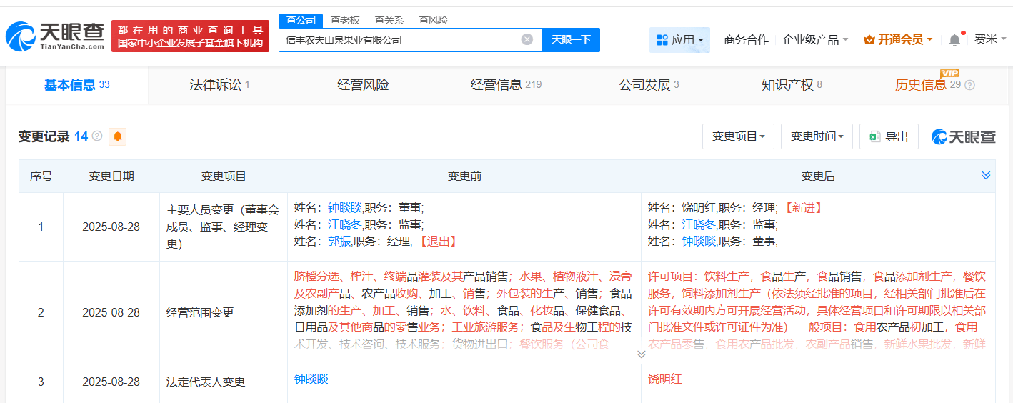 天眼查工商信息显示,近日,信丰农夫山泉果业有限公司发生工商变更,钟睒睒卸任法定代表人,饶明红接任法定代表人并担任经理。