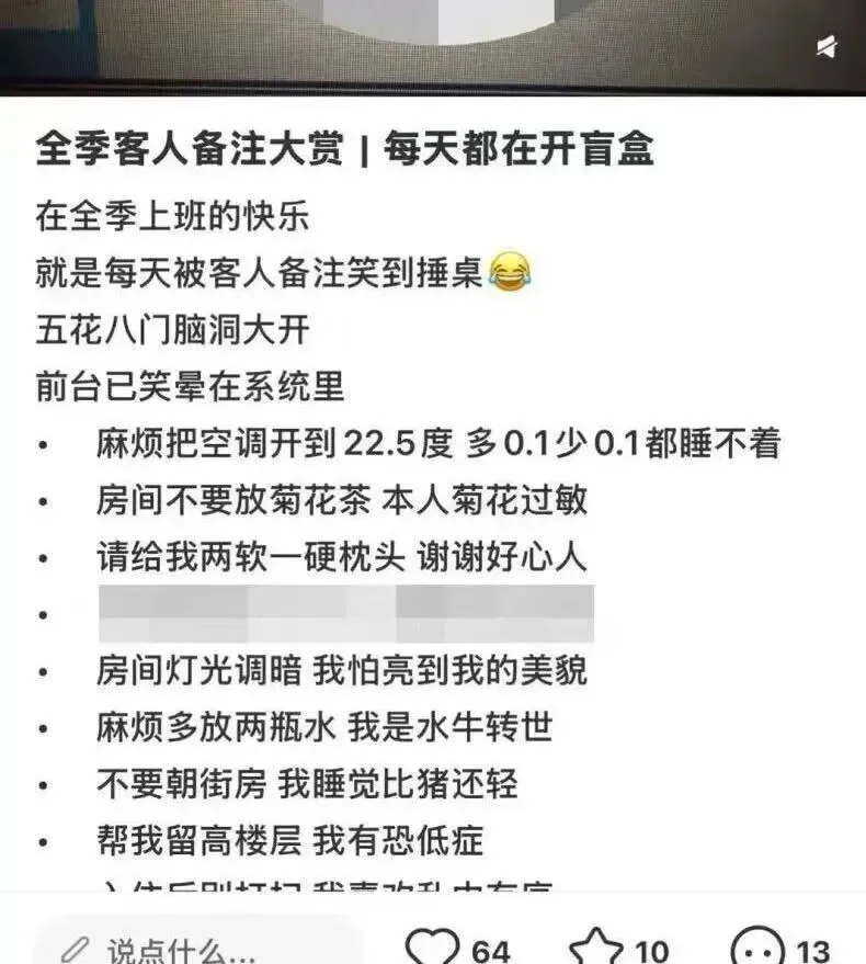 前几天,一个名为“全季大连xx酒店”的账号发布的一篇“全季客人备注大赏”帖文在社交平台引发争议。有网友在平台发文表示:“刷到这篇帖子的时候非常反感……一个酒店官方账号,私自将客人订单备注发到网上。”