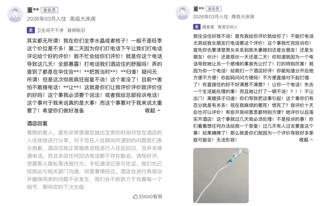事情过去没多久,又有网友发现,华住会高级会员对桔子水晶酒店打下差评,称酒店一通回访电话导致他出轨暴露、婚姻破裂。一些网友认为,出轨是客户自身问题,酒店实在是无妄之灾;但也有不少网友指出“回访电话涉及隐私问题”。