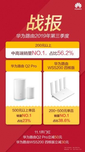 一年一度的双11马上来临,华为智选官方微博于11.1日开门红前公布了华为路由器第三季度的成绩:华为路由器已经登顶200元以上中高端销量NO.1,占比56.2%;其中明星产品华为路由Q2 Pro则是以23%的份额,占据500元以上高端路由单品销量NO.1;华为路由WS5200四核版则是以38.6%的份额,占据200~500元中端路由单品销量NO.1。