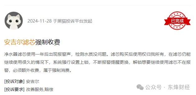 也有消费者表示,安吉尔净水器滤芯使用一年后出现报警声,检测水质没问题,在滤芯仍能继续使用很久的情况下,系统强行设置上锁,不断报警提醒更换,解锁想要继续使用滤芯不再报警,必须额外交费,属于强制消费。