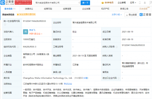 【TechWeb】企查查APP显示,8月19日,常州威途信息技术有限公司成立,法定代表人为肖志飞,注册资本1亿美元,经营范围包含:汽车零配件零售;电子产品销售;机械设备销售;办公设备销售等。