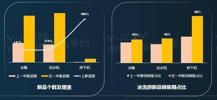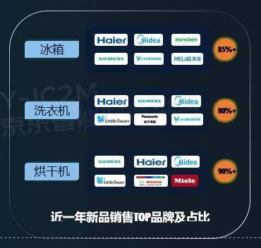 近一年,京东冰洗烘新品数量及上新速度稳步增长,冰箱、洗衣机、干衣机的上新速度同比去年分别增长141%、174%和486%,新品贡献的销售额占比也达到了44%、46%和88%。各大头部品牌不断更新,市场集中度提升,引领新品销售增长。其中,冰洗烘热销前五品牌所占份额分别达到85%、80%和90%。