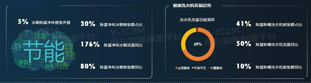 疫情重塑用户消费观念及习惯,健康、除菌功能受到空前关注。近一年京东除菌净味冰箱流量同比增速176%,销售额同比增速80%。在对洗衣机杀菌功能调研中,69%用户表示必须要有杀菌功能。