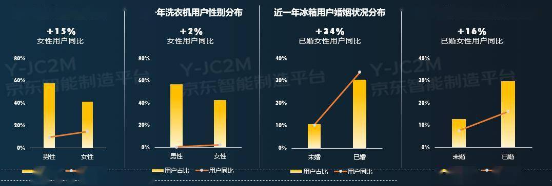 当代女性承担多重社会角色,成为消费的主导力量。近一年京东冰洗产品的购买决策中,女性相对于男性的比重进一步提升,尤其是已婚女性是绝对主力。以冰箱为例,近一年购买冰箱的女性用户占比41%,其中已婚女性用户占比31%,同比增长达34%。
