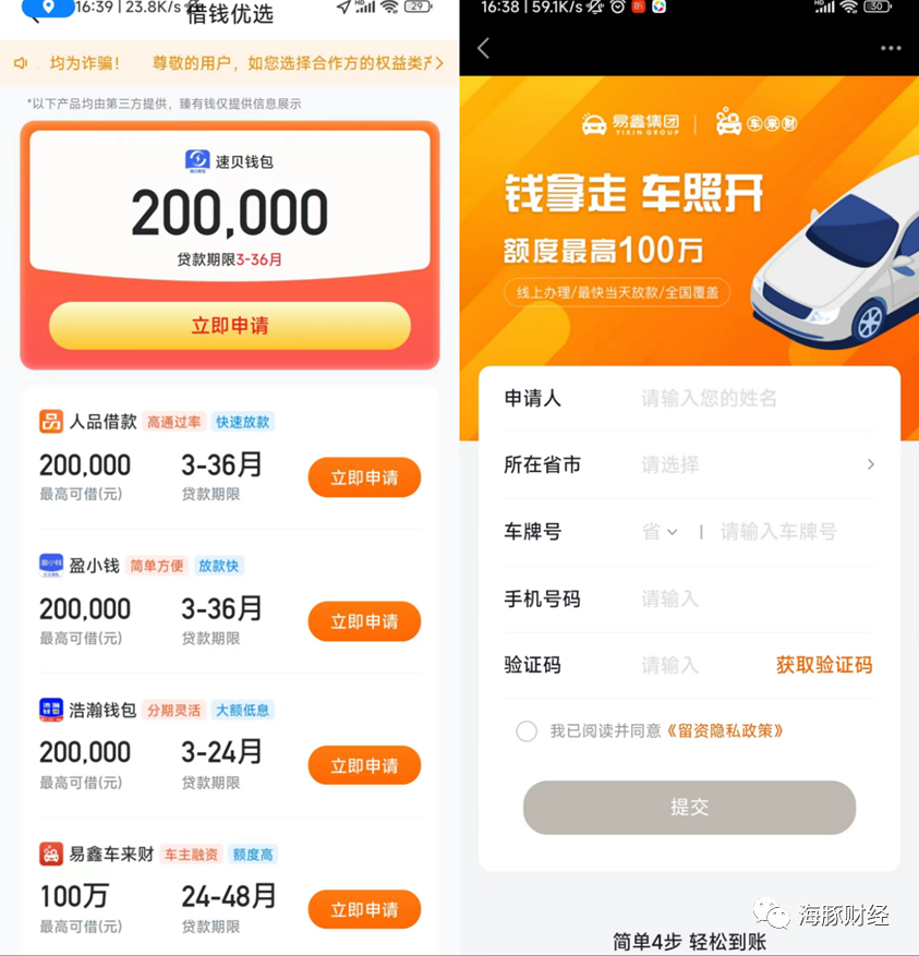 海豚财经发现,易鑫集团-车来财是携程金融-车抵贷合作的合作机构之一,爱奇艺、QQ钱包、哈啰借钱在给易鑫车抵贷导流时,采用的是页面直接跳转模式,平台不接触用户个人信息,而是由易鑫直接收集。