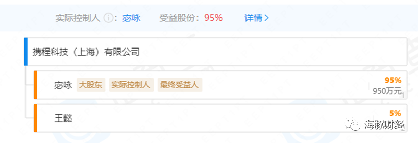 企查查显示,携程科技(上海)的股东为宓咏(持股95%)和王懿(持股5%)。公开信息显示,宓咏为携程金融支付中心CEO,并在2021年5月担任上海程付通支付有限公司的法定代表人,后者的前身是第三方支付公司上海东方汇融信息技术服务有限公司。