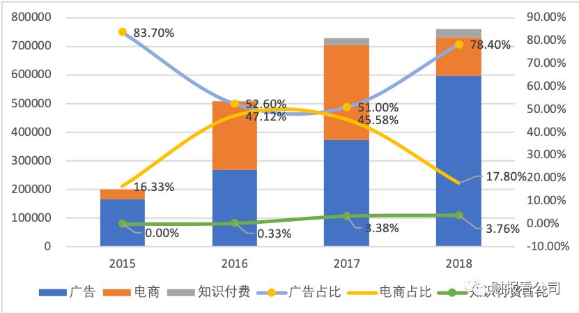 再来看一下这三块儿各自贡献的毛利率水平,电商业务在2017年为48.6%,2018年提高到了50.4%,但远低于同年广告的84.7%和知识付费的91.5%。