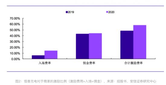 不能构建品牌护城河,意味着品牌营销费用将居高不下。从怪兽充电的招股书可以看出,2019年、2020年怪兽充电的总营收分别为20.22亿元和28.09亿元,而其营销支出分别为13.62亿元和21.21亿元。营销费率分别为67.4%和75.5%。可见为了业务扩张,其在营销上付出的代价并不低,原因就是因为商家要求更高的入场费。