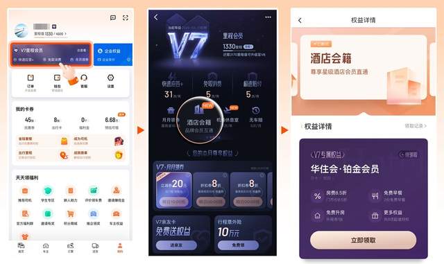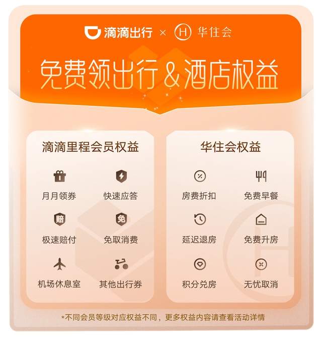 同时,华住会银会员、金会员、铂金会员可以对应兑换滴滴里程会员V3、V6、V7权益,V3会员可享月月领券、出行礼包;V6会员可多享快速应答权益、免取消费权益、极速赔付权益;V7会员加享机场休息室权益。用户可在滴滴出行App查看具体权益详情。