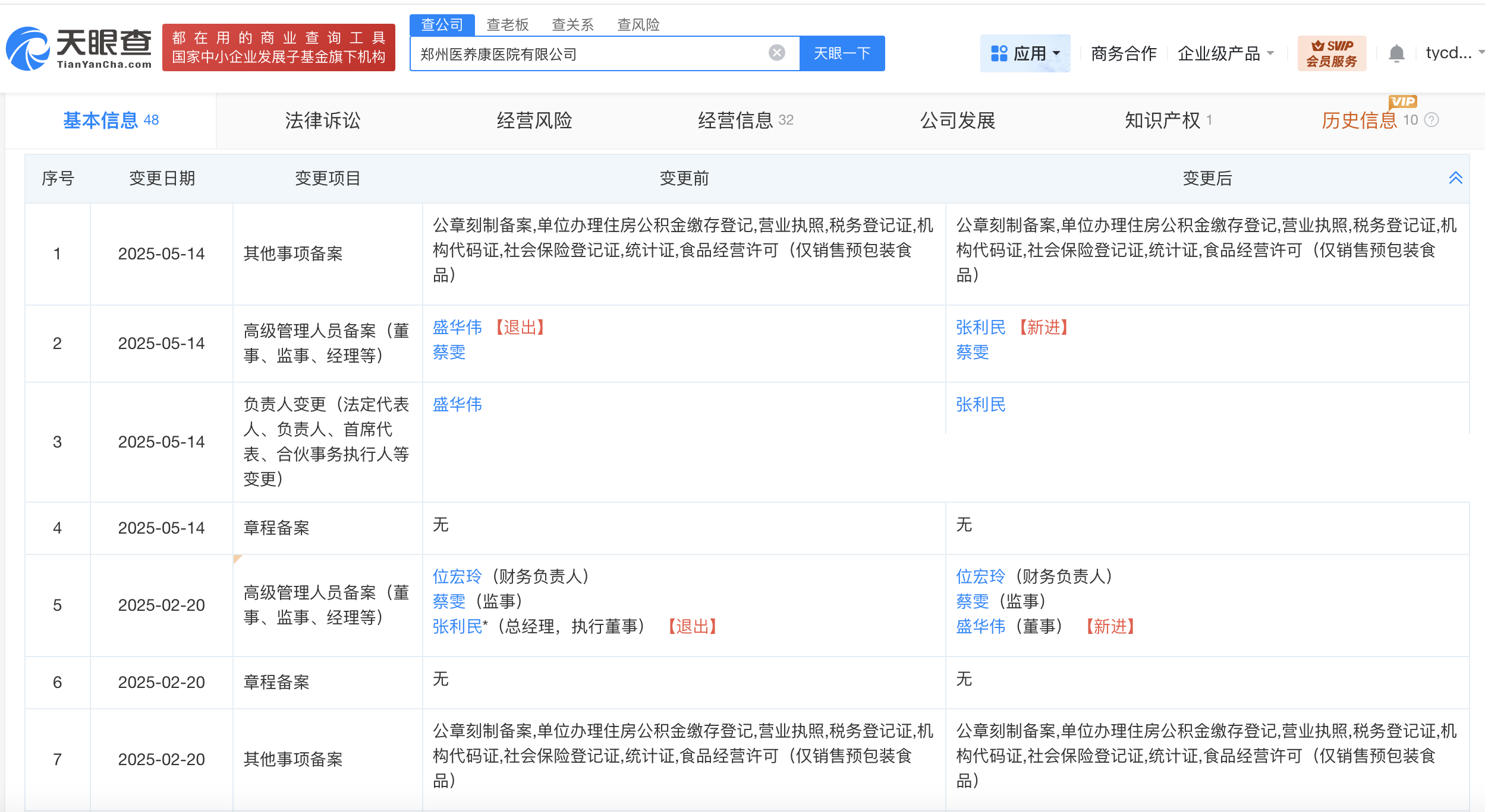 天眼查App显示,涉事的郑州医养康医院有限公司成立于2023年3月,法定代表人为张利民,注册资本1000万人民币,经营范围包括医疗美容服务、医疗服务、药品零售、中医养生保健服务(非医疗)等。股东信息显示,该公司由河南省医养康健康产业集团有限公司全资持股。变更记录显示,今年2月,张利民卸任该公司法定代表人、总经理、执行董事,由盛华伟任法定代表人、董事;今年5月,盛华伟卸任上述职务,由张利民接任。
