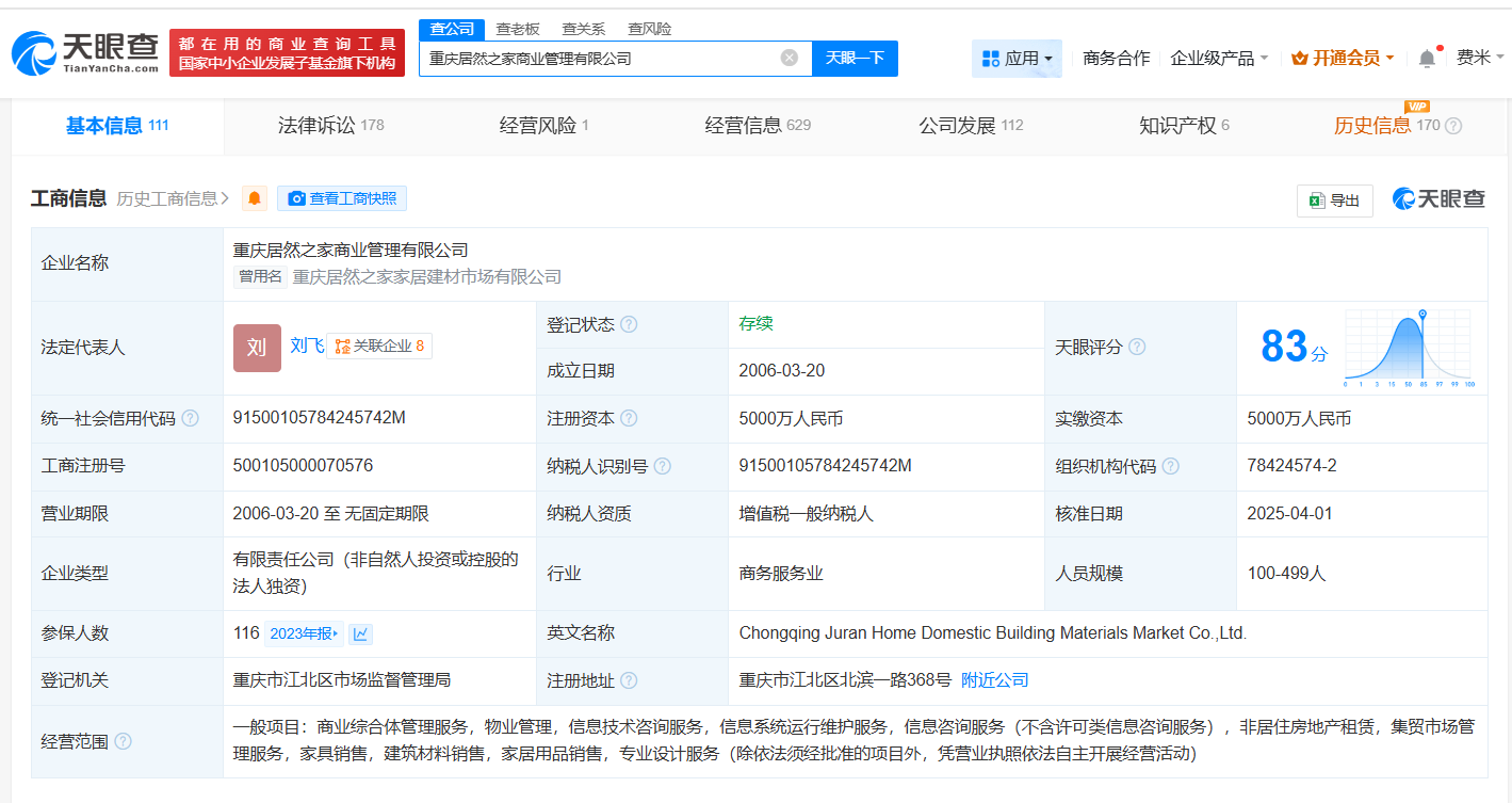 该公司成立于2006年3月,法定代表人为刘飞,经营范围包括商业综合体管理服务、物业管理、信息技术咨询服务等。股东信息显示,该公司由居然智家旗下北京居然之家金源家居建材市场有限公司全资持股。