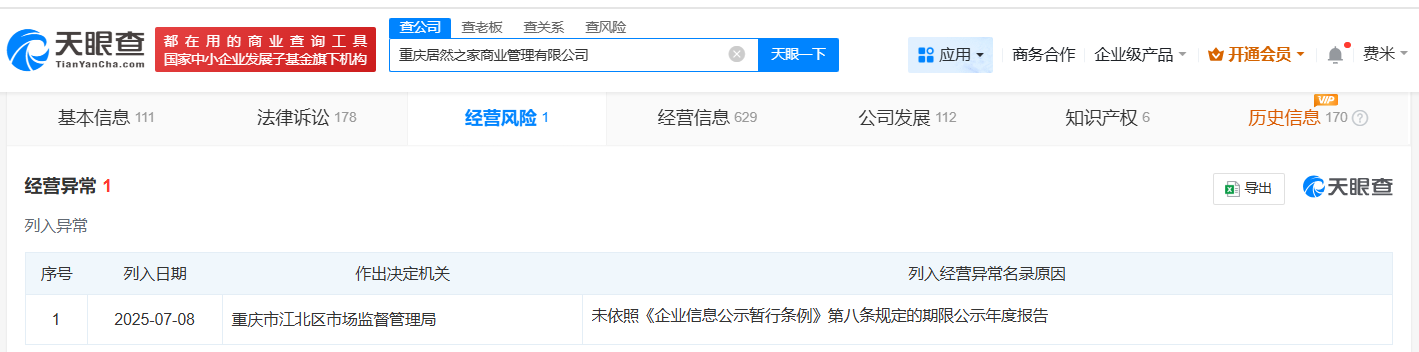 天眼查经营风险信息显示,近日,重庆居然之家商业管理有限公司因未依照规定的期限公示年度报告,被重庆市江北区市场监督管理局列入经营异常名录。