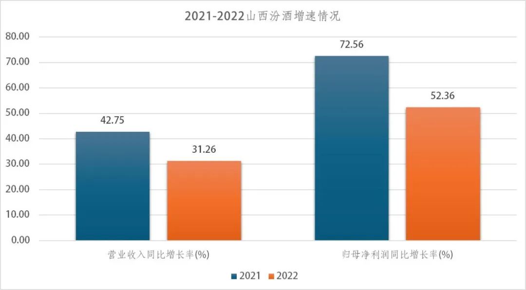 2022年,山西汾酒实现营业收入262.14亿元,较上年同期增长31.26%;实现归母净利润80.96亿元,较上年同期增长52.36%。虽然实现了较大程度的增长,但汾酒2022年表现仍低于市场预期。2021年同期,汾酒的营业收入同比增长42.75%,归母净利润同比增长72.56%。