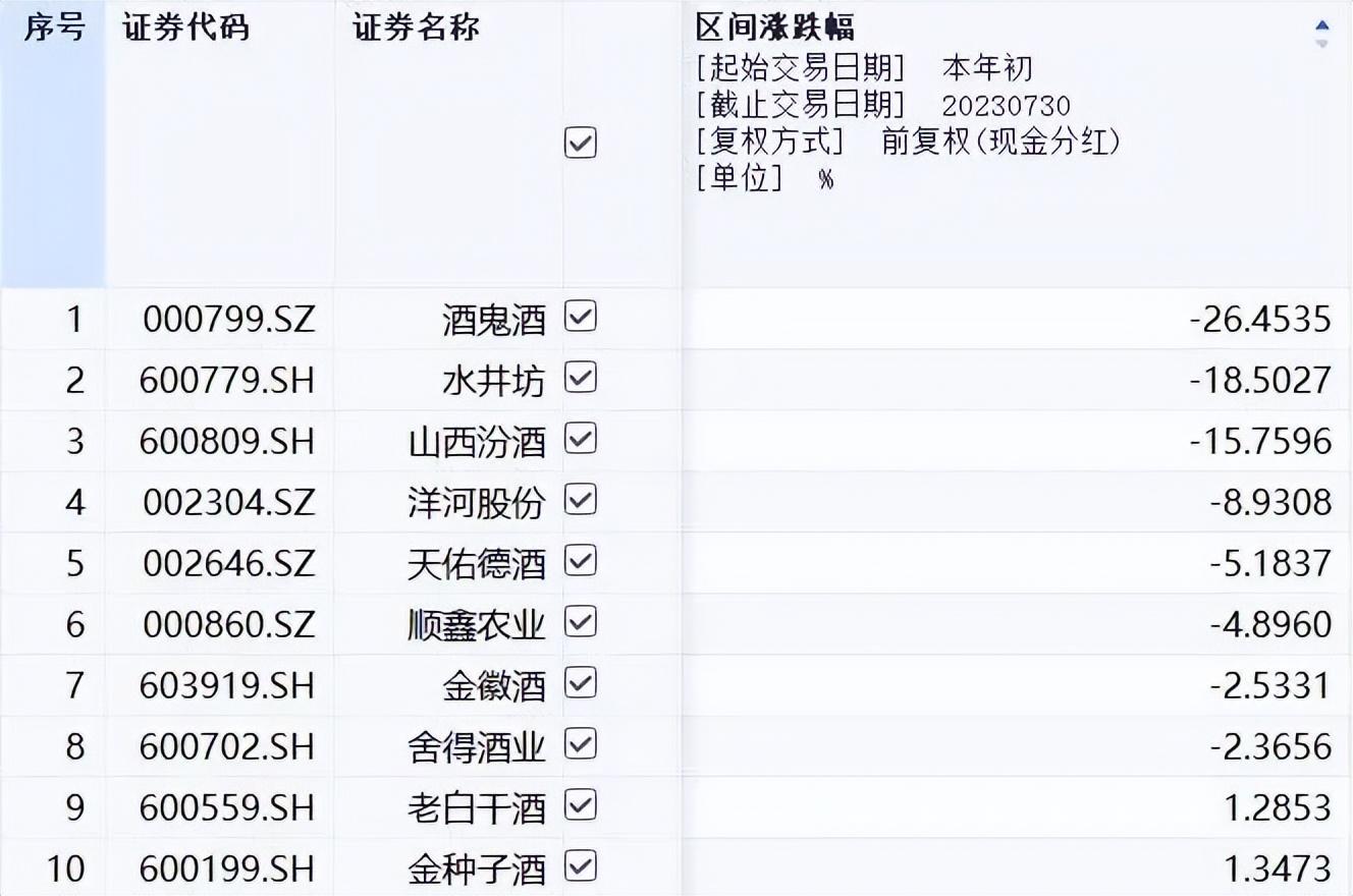 以2023年年初至7月末的数据来看,A股白酒行业共有20家上市公司,至今年年初至7月30日,山西汾酒区间跌幅为15.76%(以前复权计),位列全市场第三。有业内人士认为,只有行业长期逻辑变差,才会有这样的下跌幅度。